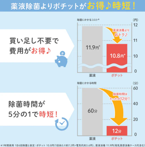 ポチットやスチームメイトのスチーム除菌&乾燥器は面倒な哺乳瓶の除菌&乾燥を自動で行ってくれるとても便利な育児グッズです!